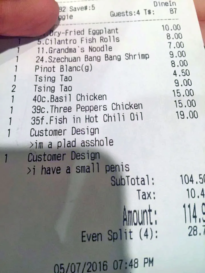 It shouldn’t need saying that this is a dangerous and damaging thing for staff to do. But what shouldn’t go without saying is that it’s your problem, not theirs. At some point you didn’t assert a culture that would preclude a server trying to punish a guest for some perceived injury. Peter Chang, the owner of the restaurant at the heart of this story, knows it was his job to right his ship… and man, did he. He fired four of his staff for the unprofessional remarks, including his own daughter. His reasoning was as clear as it was simple: Business is business and no one is above accountability. It’s a great lesson, however harsh, from which we can all learn.